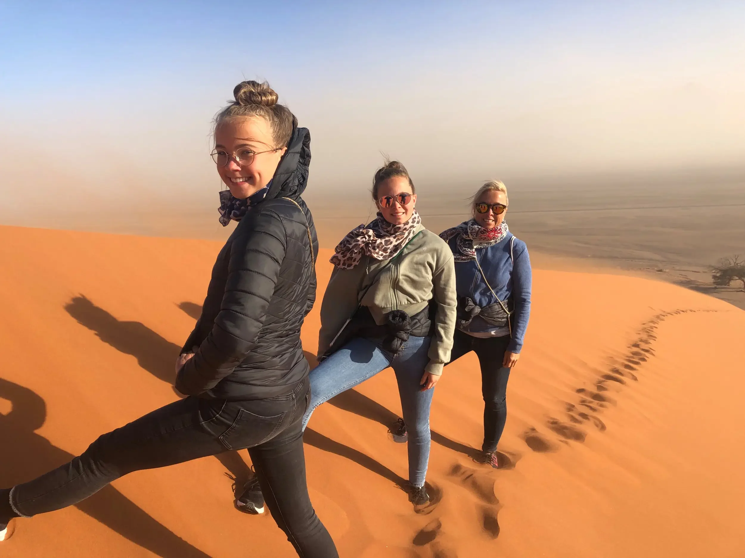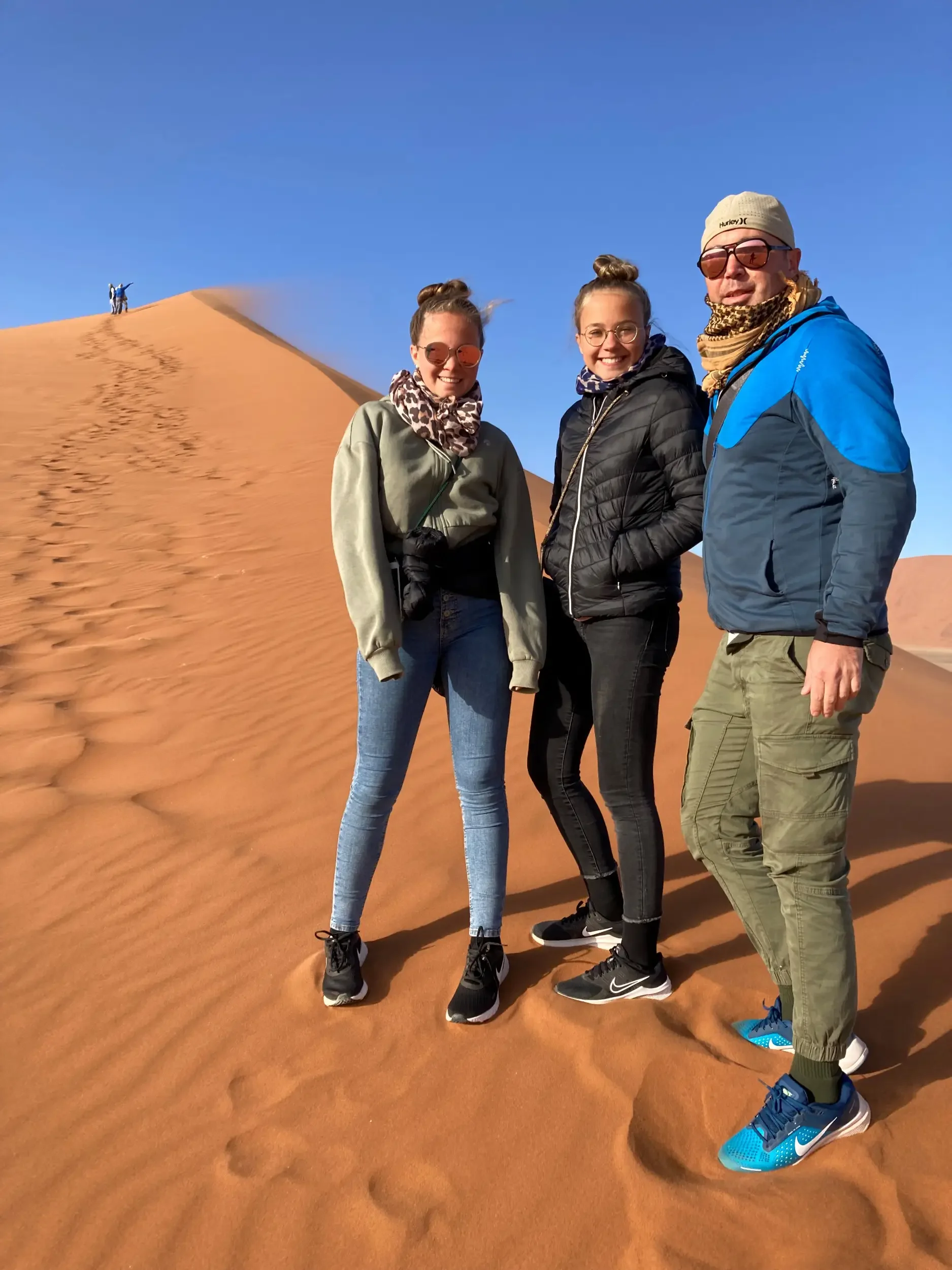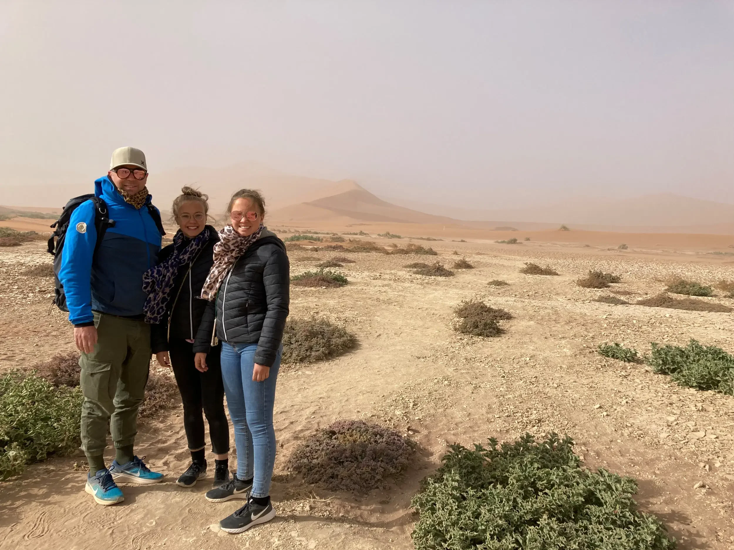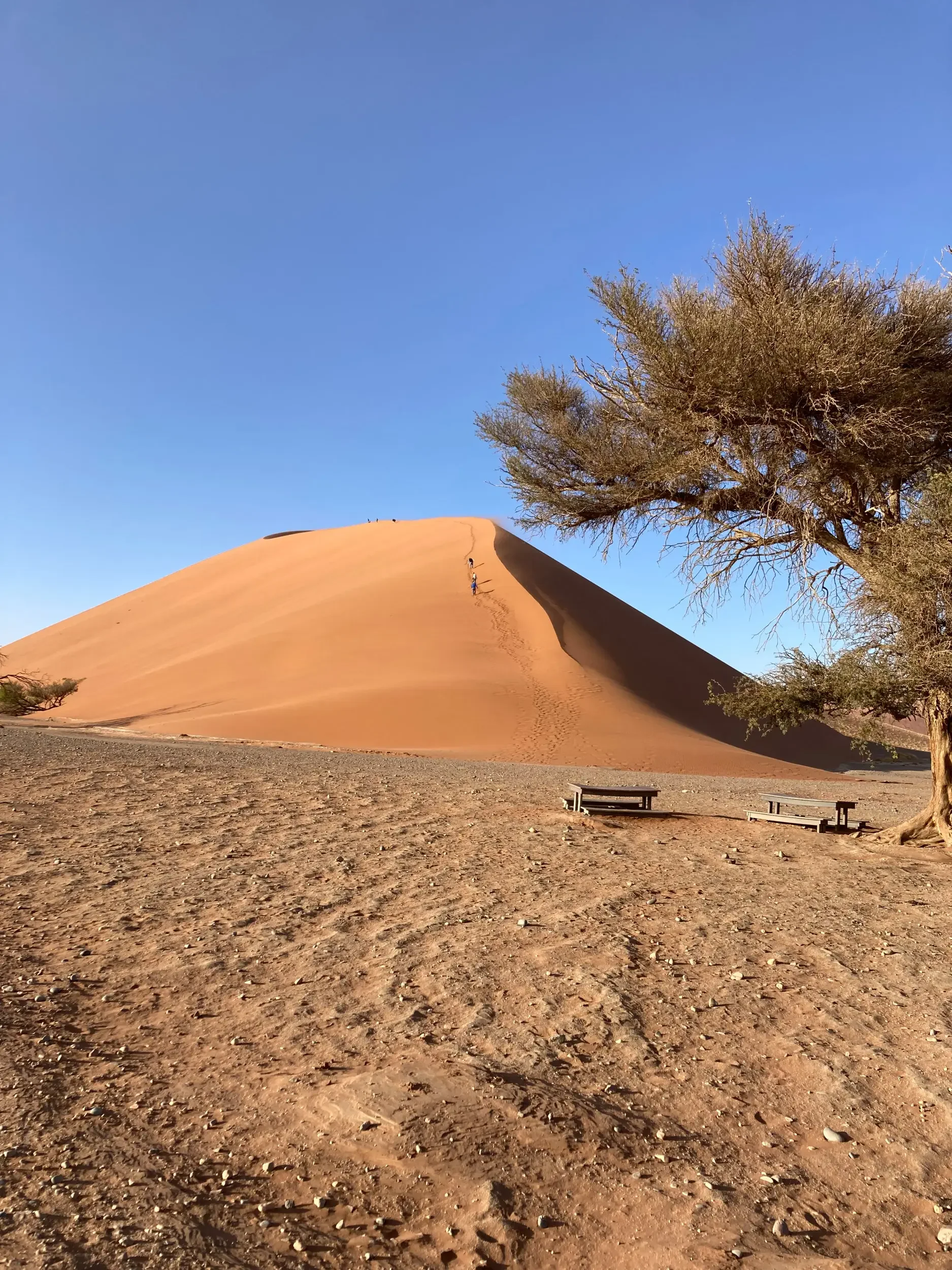 During the night, we were all jolted awake by strong winds — and unfortunately, they showed no mercy by morning. Still, today was the day: off to the world-famous Deadvlei, with its preserved camelthorn trees standing in a white clay pan, framed by the glowing red dunes of the Namib.