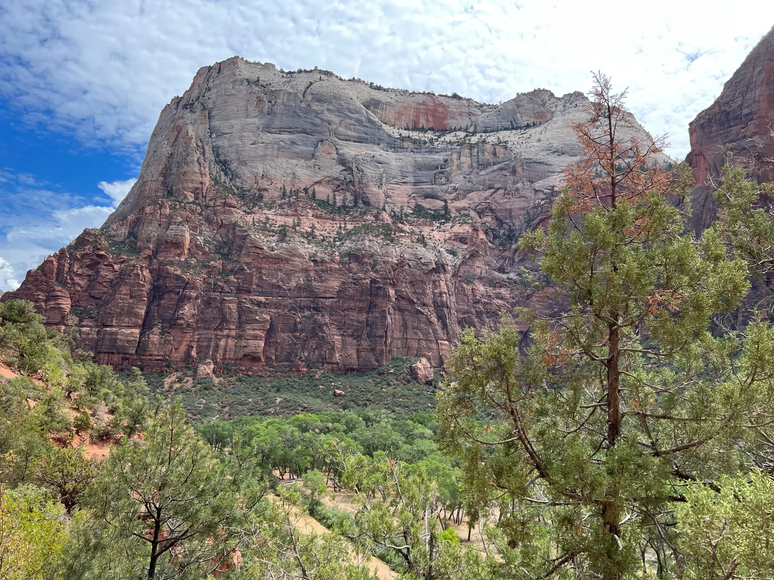 The nature here is absolutely stunning. Lush green trees flow almost seamlessly into deep, dark reds, fading further into rock layers so light they look nearly snow-white. Zion is one of those places that constantly shifts in color and mood — and never stops impressing.